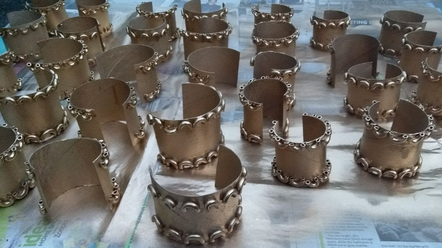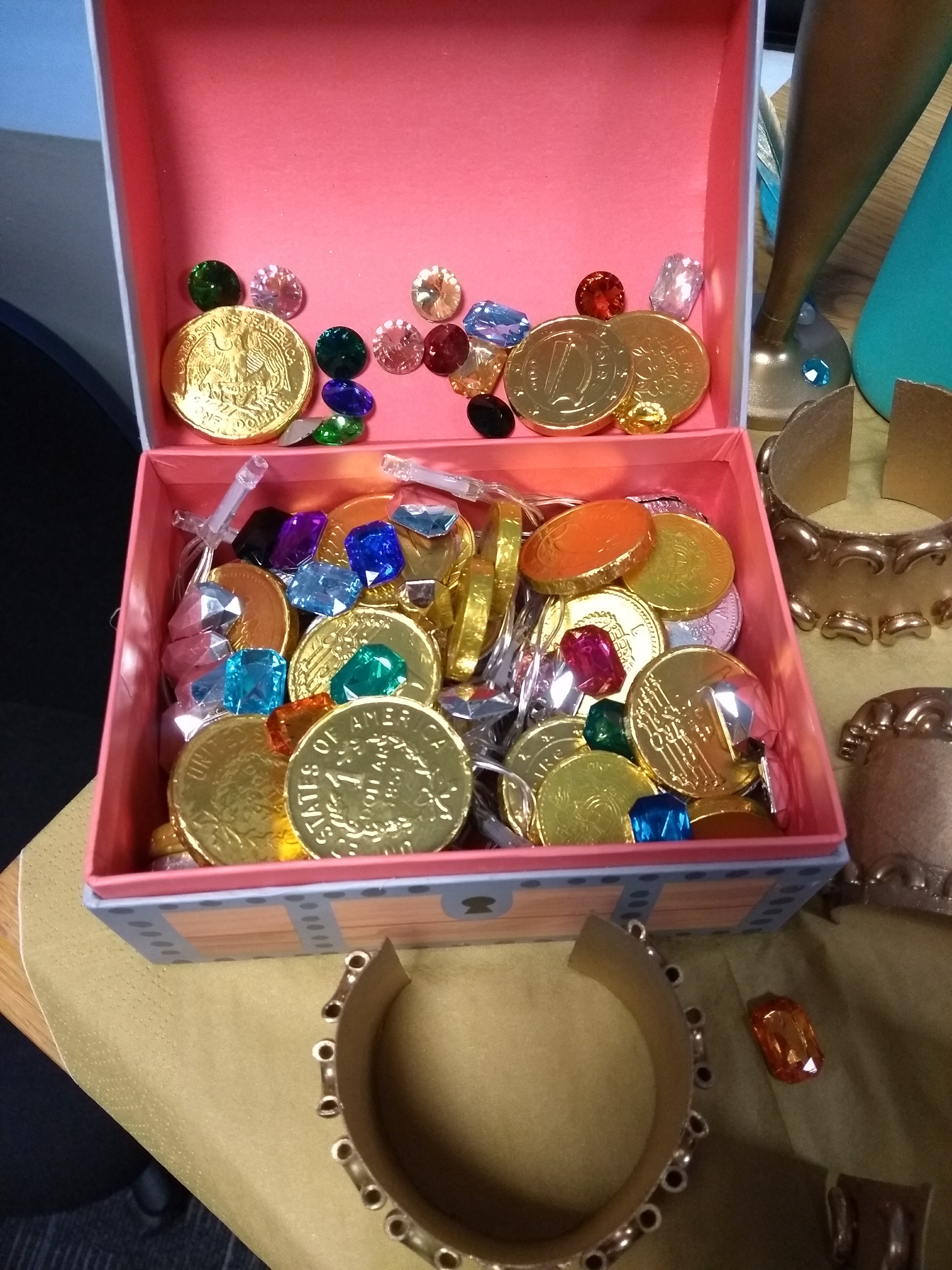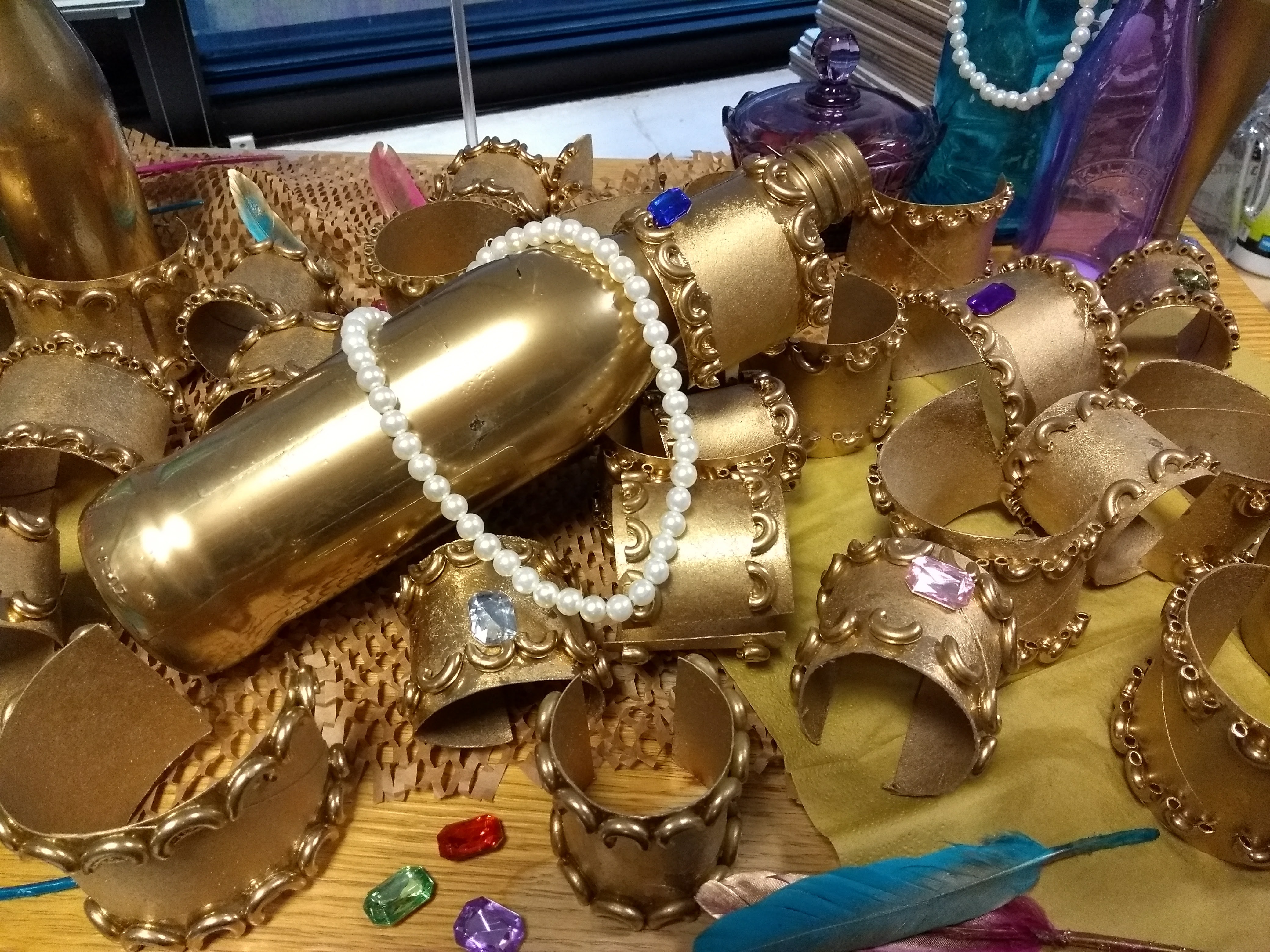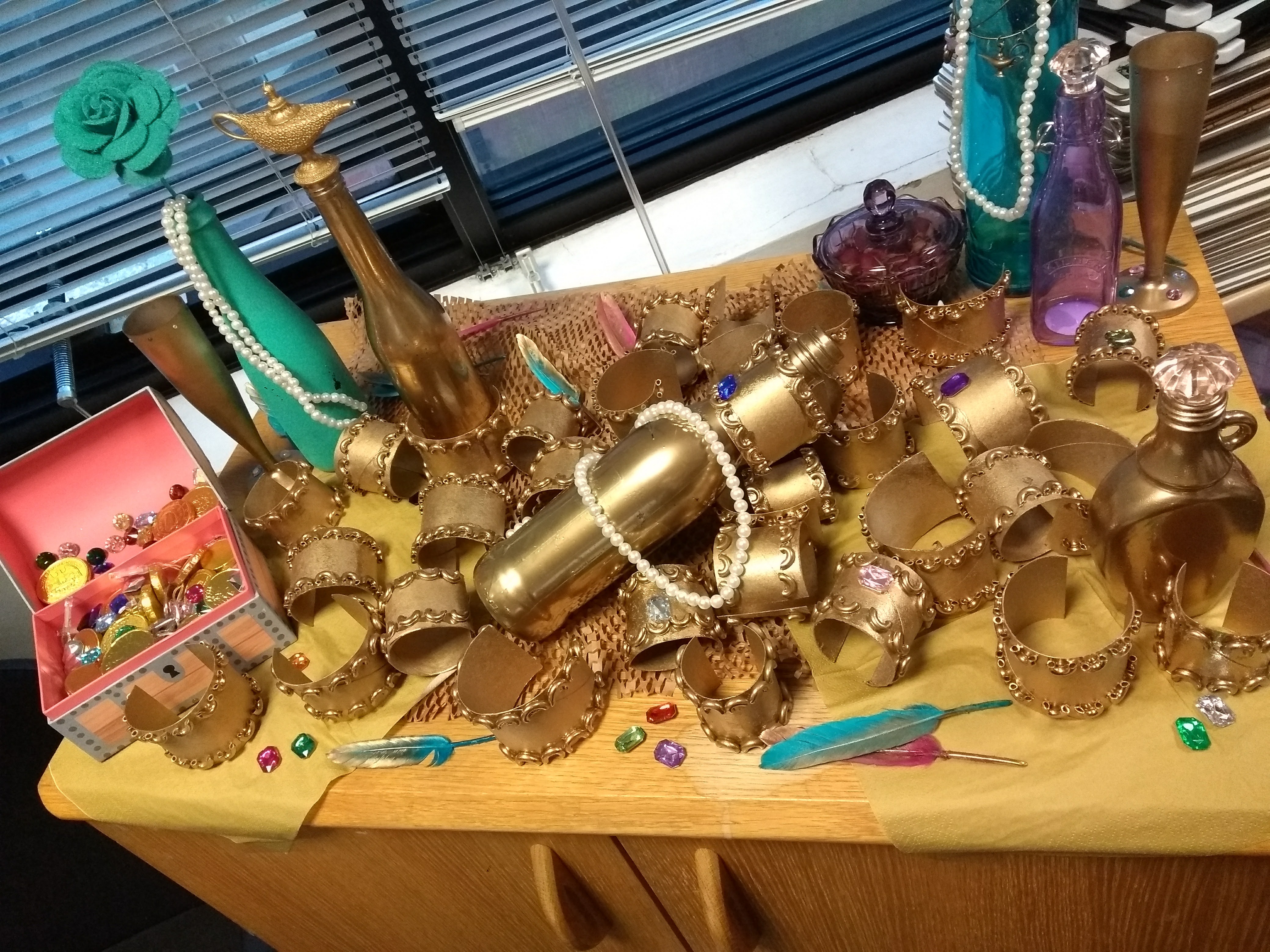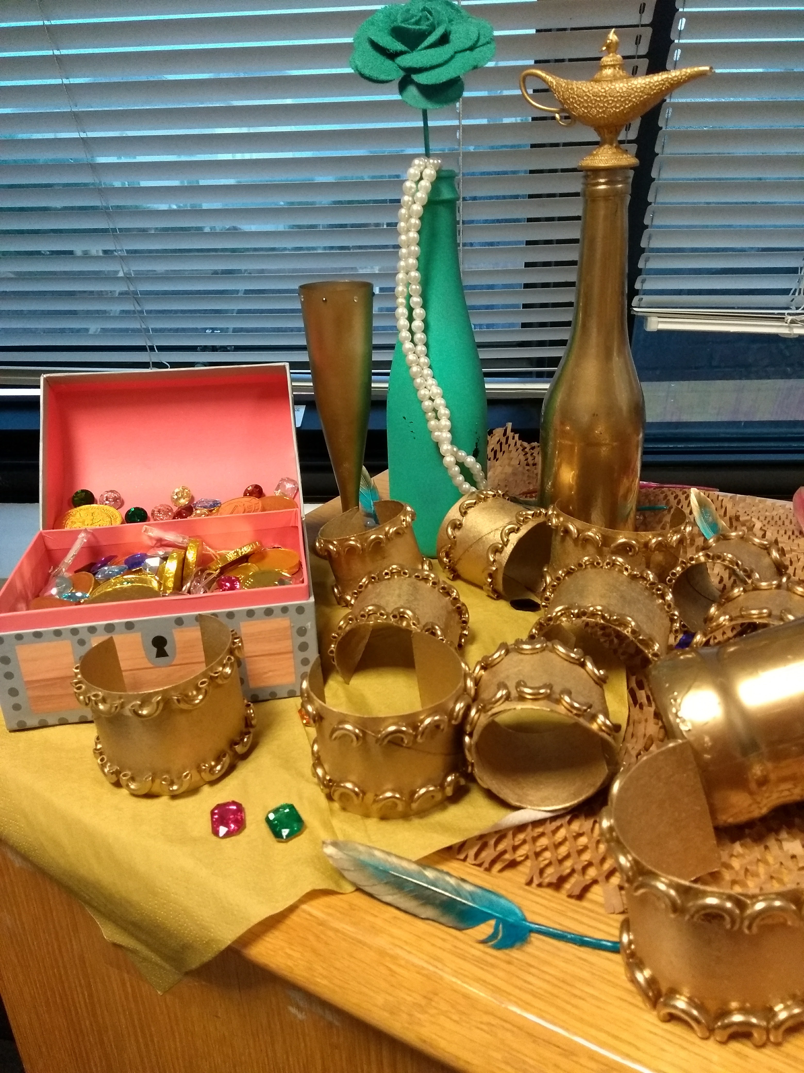 I made golden bracelets out of toilet paper rolls, macaroni and gold spray paint – they looked great! I also spray painted some glass bottles and fabric flowers in gold and turquoise and lined pearls on strings. Combined with gold foil chocolate coins, some glass crystals and a treasure chest they made a fantastic Cave of Wonders! For the photo booth, I made themed props out of coloured card stock. The spray painted plastic flutes from the Beauty and the Beast event turned into glittering goblets with the help of some glue on flatback rhinestones.