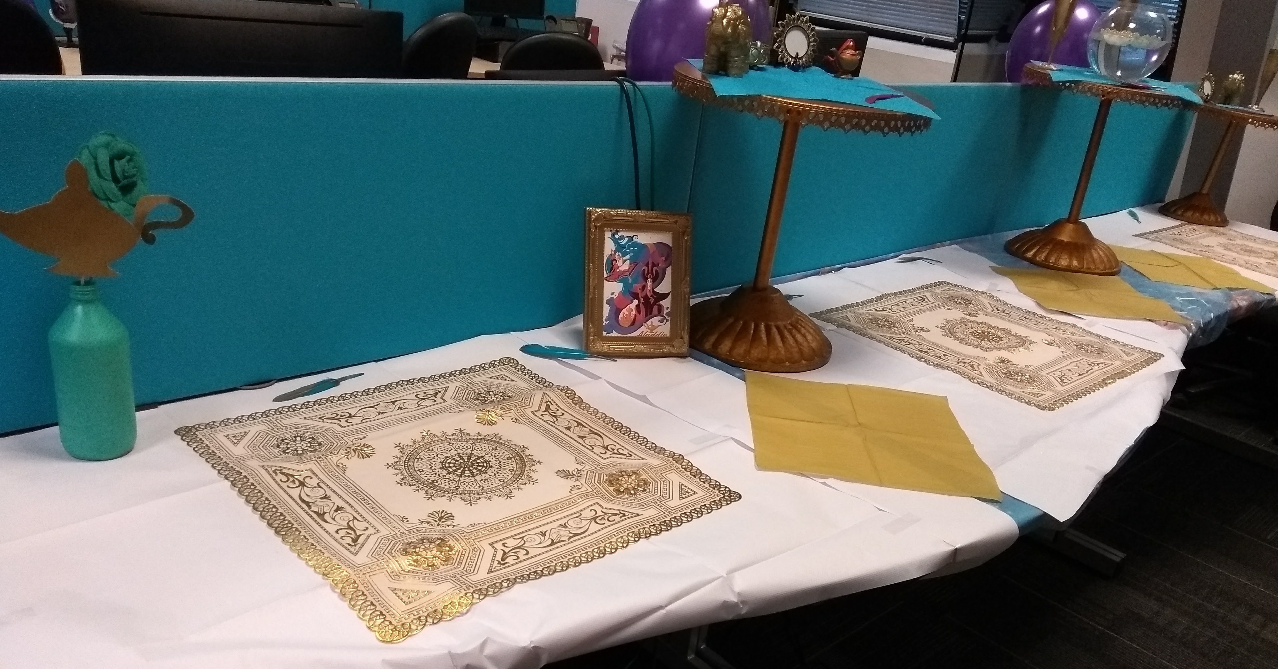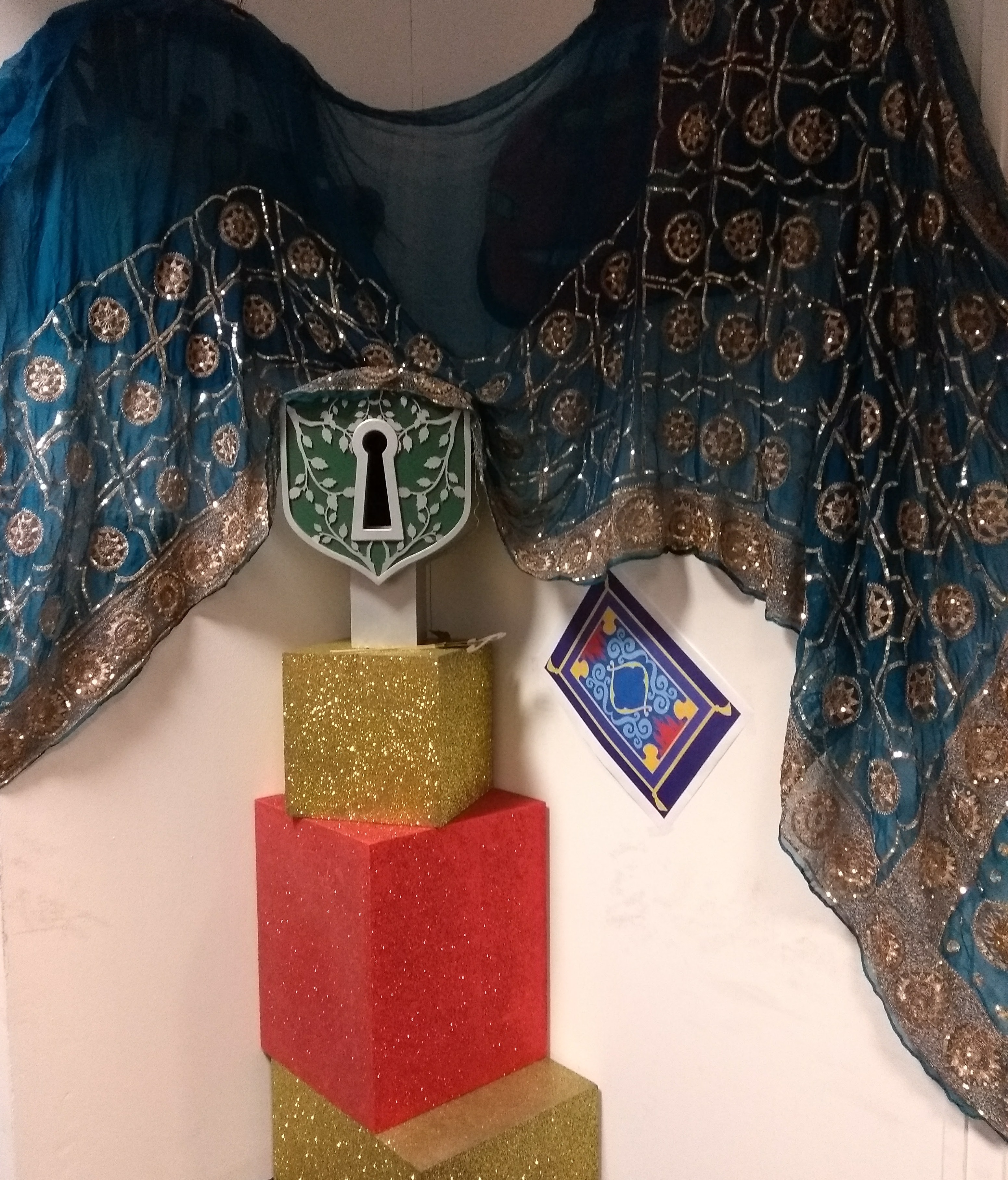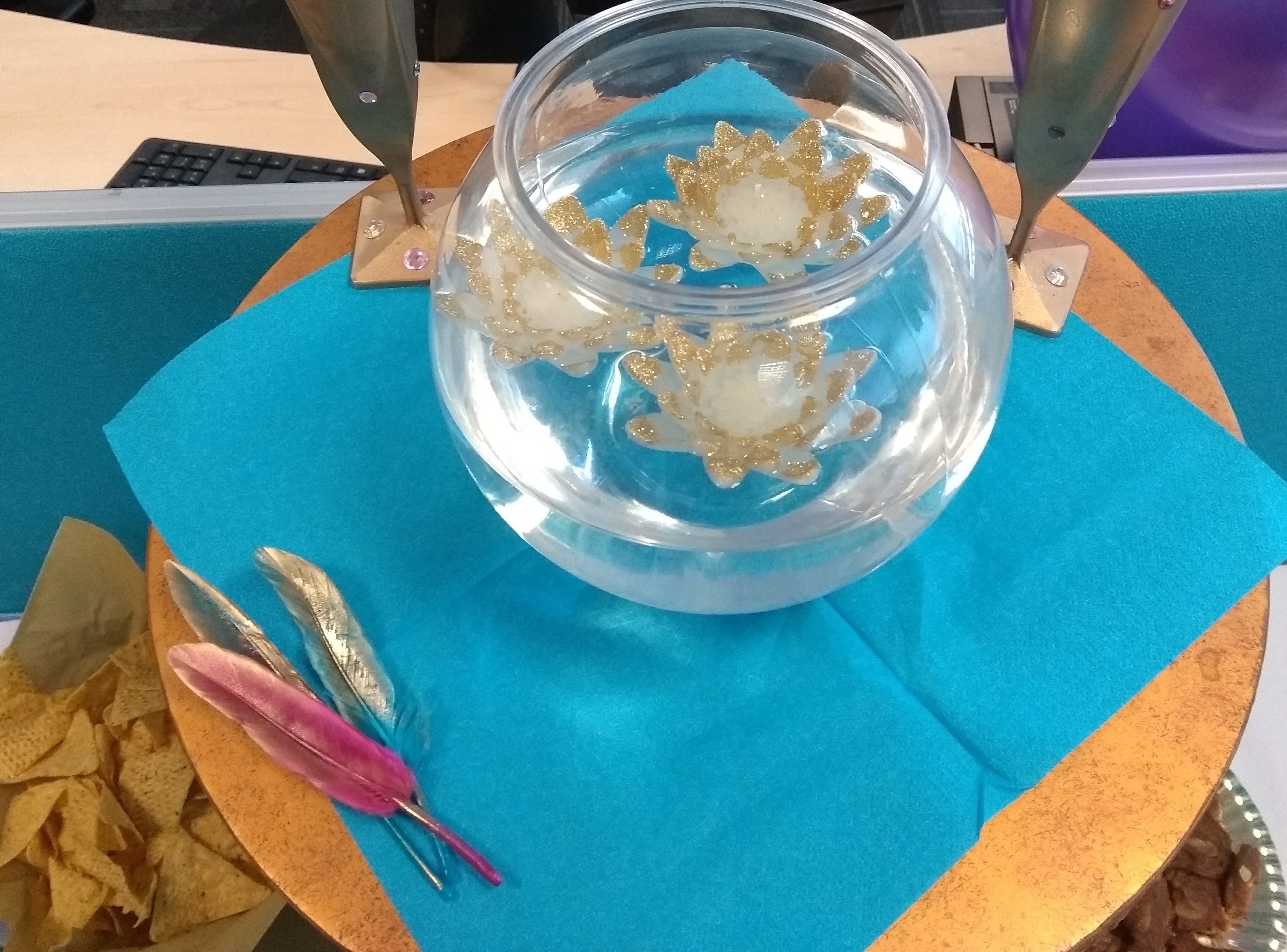 All the decorations were supposed to be very colourful, just like the movie. I also took inspiration from Persian weddings and the stories of the Arabian Nights. As our budget for these events has gone down and colourful fabrics are rather expensive – even when checking the places where you’d expect to find something on sale – I left those out and concentrated on the usual combination of crafts and bargains. I also used some of my own decorative items, some pieces from previous events and a vintage Sari I found in a vintage pop up store in my neighbourhood. That store has closed down in the meantime, but the Sari made a gorgeous background to our “photo booth” corner in the office.