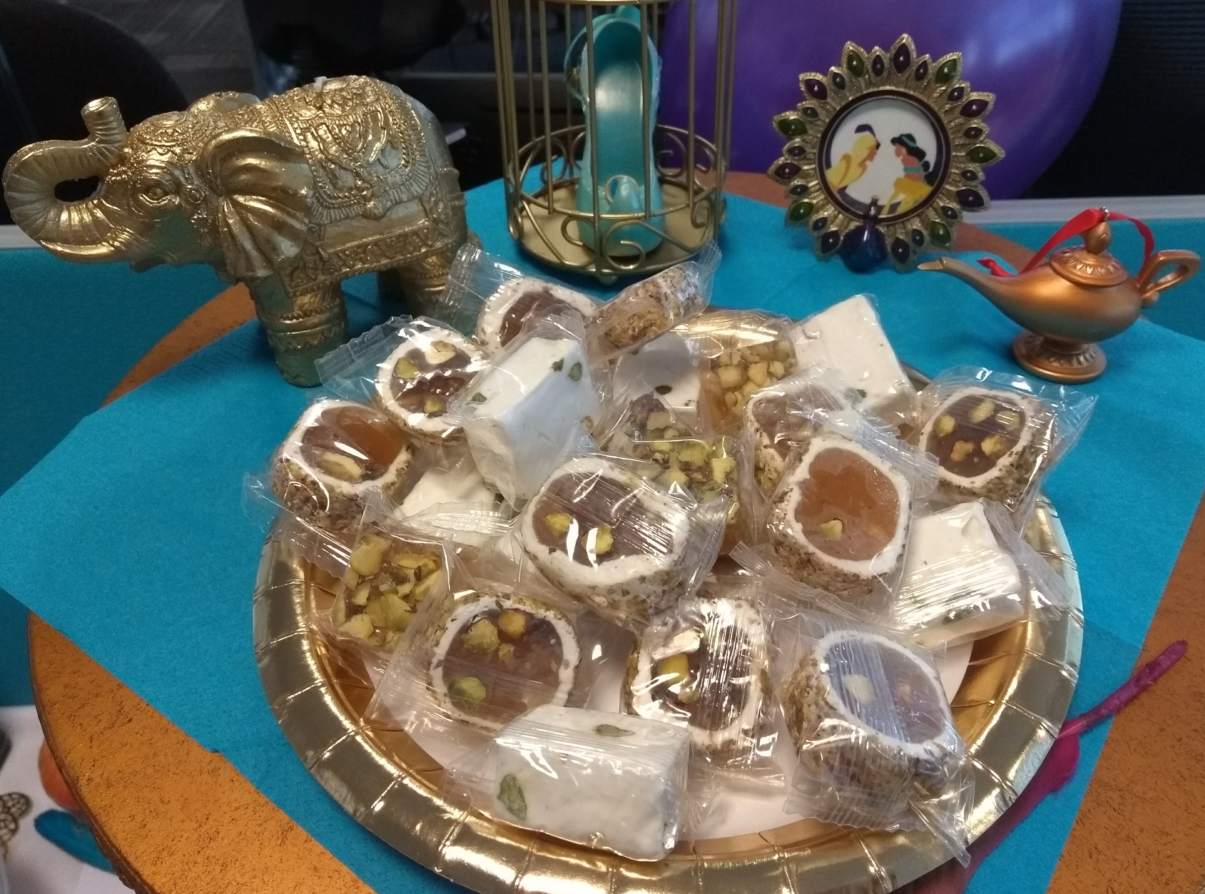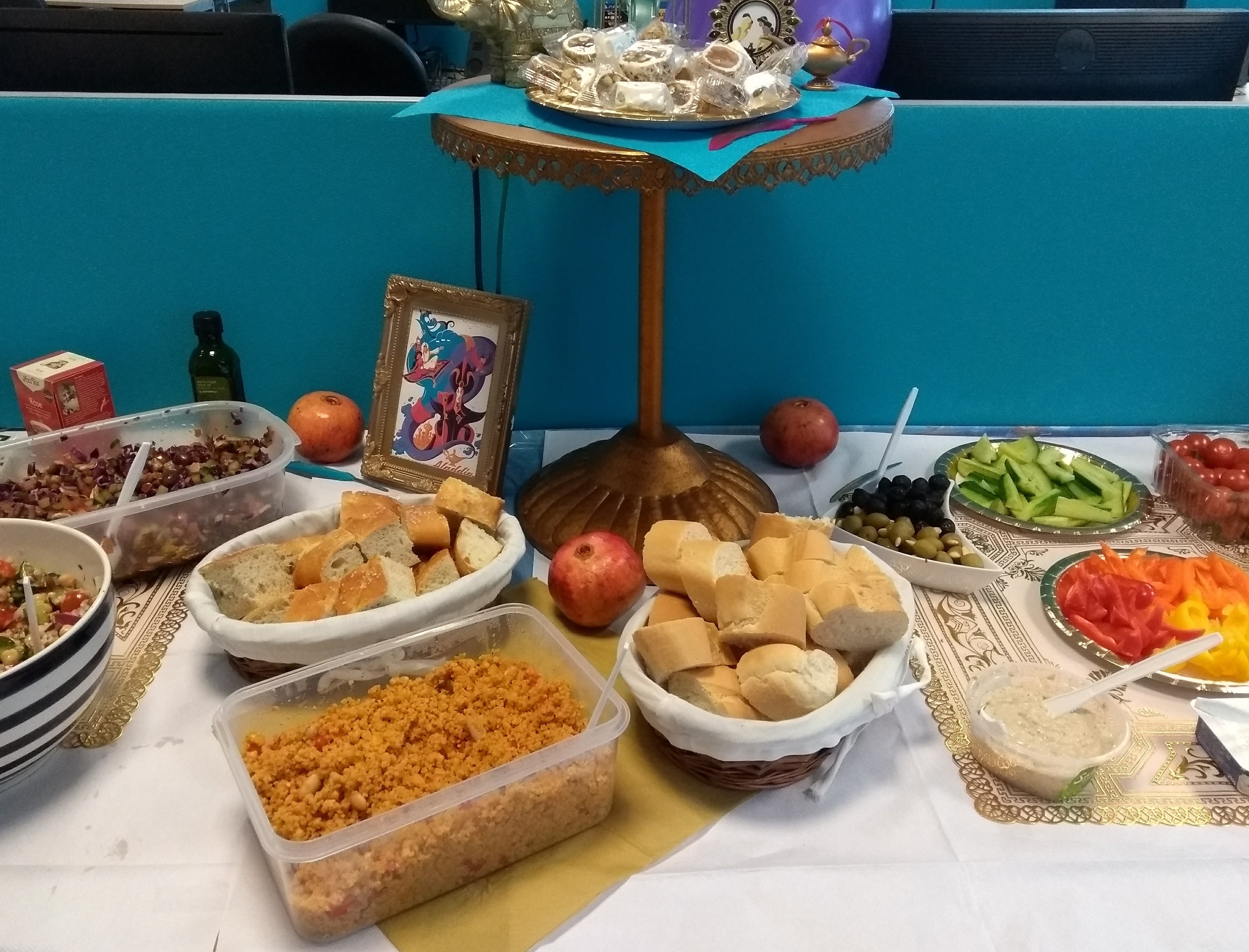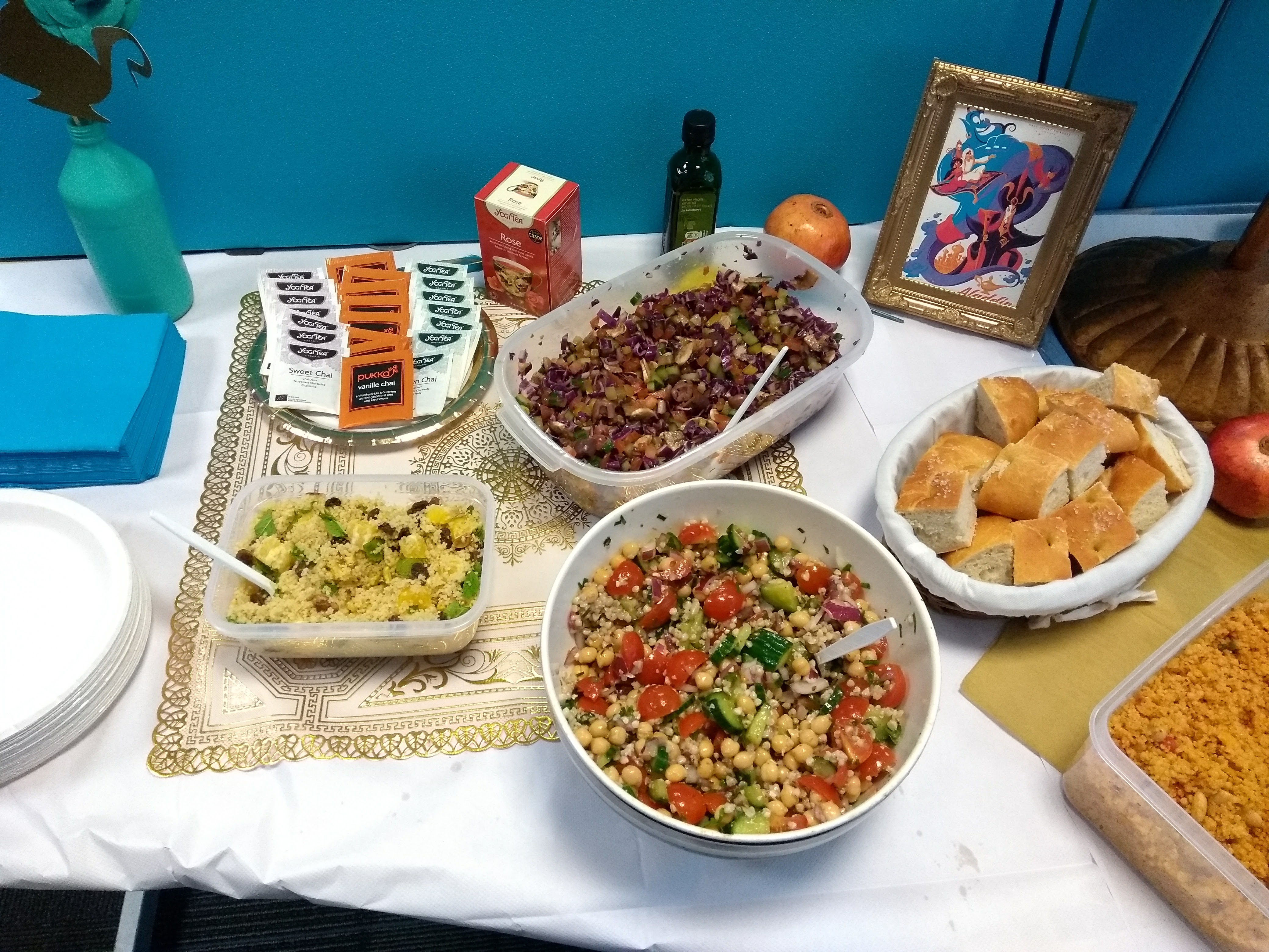 The food was the star of the event, and I planned to make it look, feel and taste authentic and to pull the whole theme together. My colleagues and I made a fantastic feast and for the first time, there was no meat on offer, all of the food was vegetarian and a lot of it was vegan – and there were no complaints. π Everything was really flavourful, from the different salads and couscous over the dips to the desserts, from the homemade Persian rosewater and pistachio fudge to the vegan Turkish delight. We also had 3 different Chai teas, almond milk and a rose tea on offer.