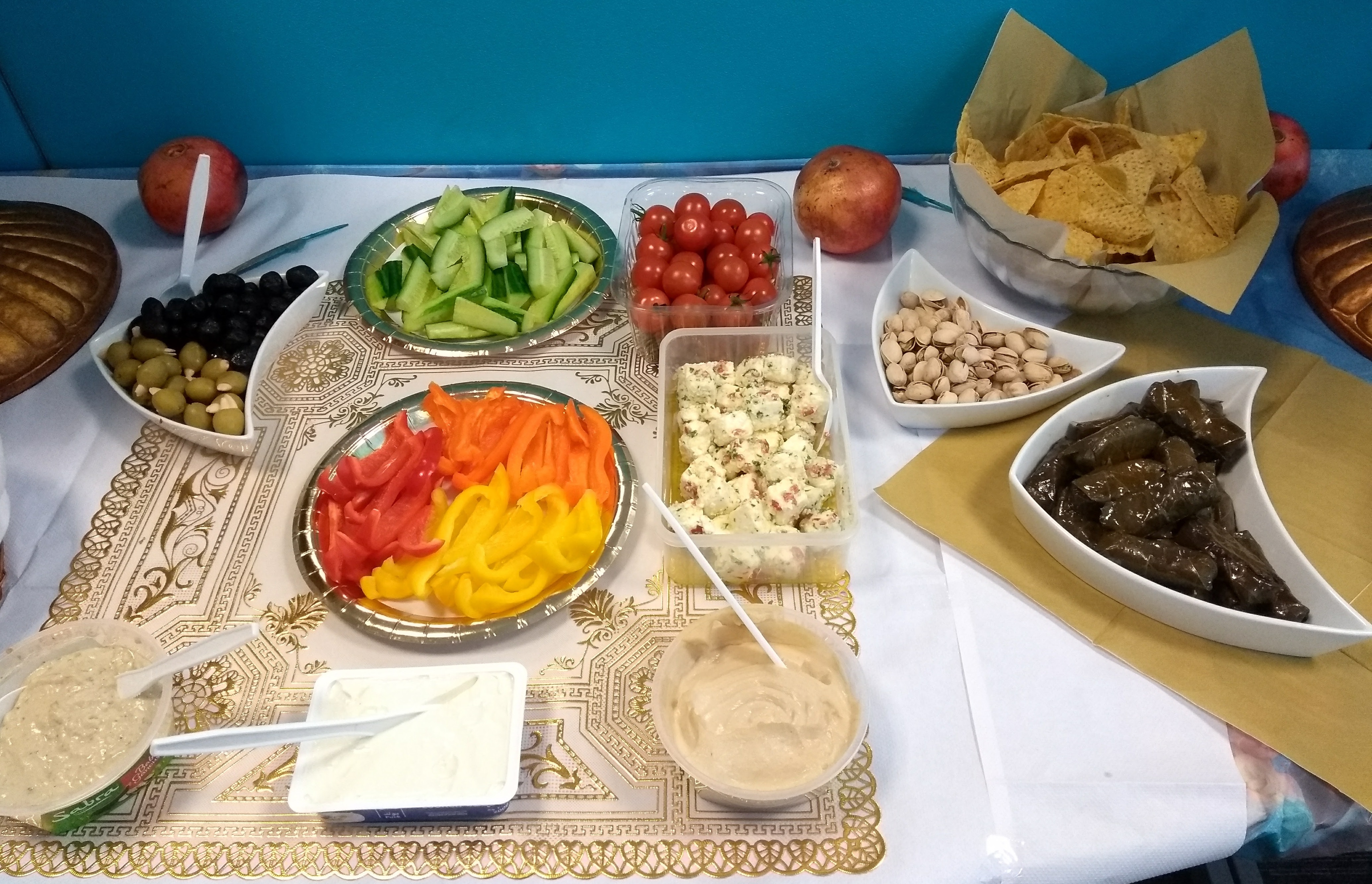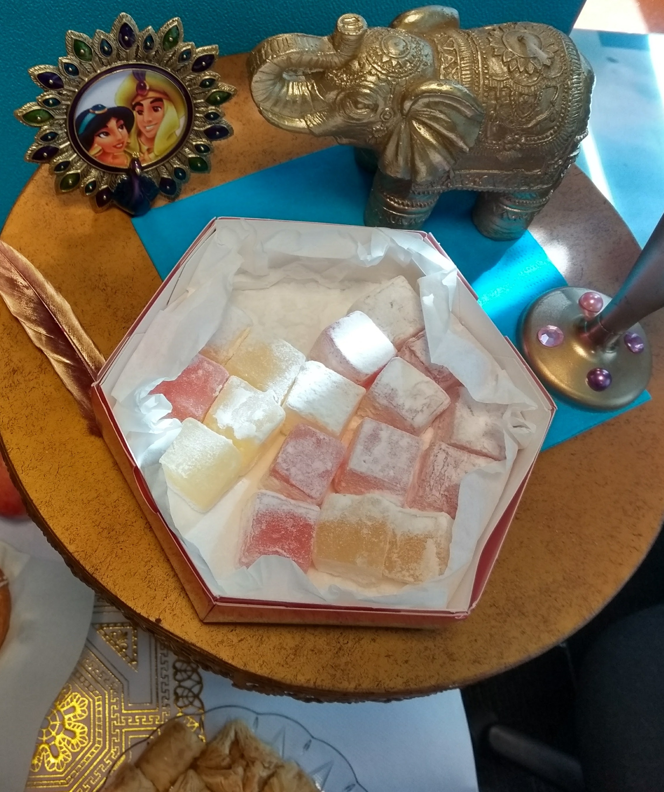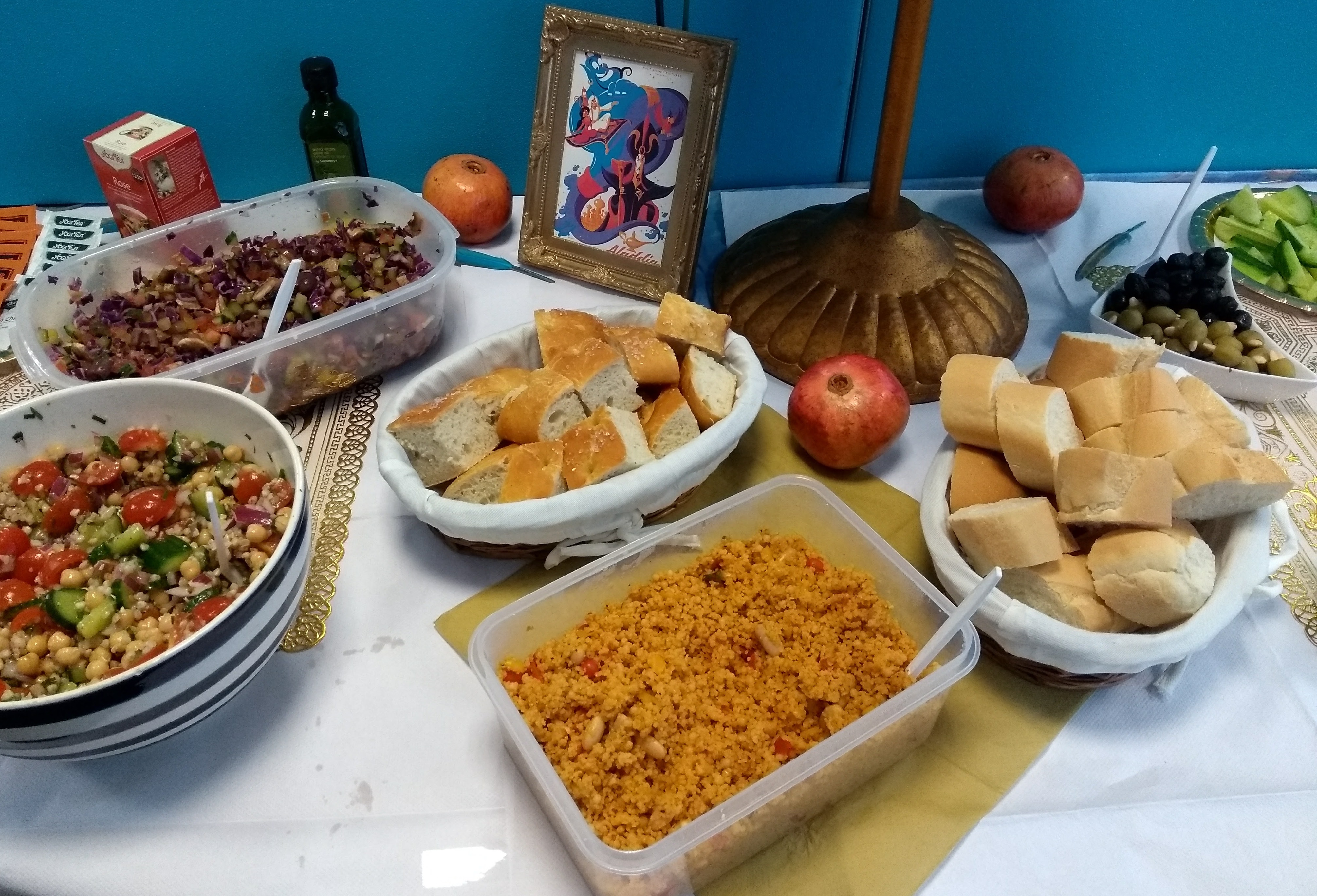 The food was the star of the event, and I planned to make it look, feel and taste authentic and to pull the whole theme together. My colleagues and I made a fantastic feast and for the first time, there was no meat on offer, all of the food was vegetarian and a lot of it was vegan – and there were no complaints. π Everything was really flavourful, from the different salads and couscous over the dips to the desserts, from the homemade Persian rosewater and pistachio fudge to the vegan Turkish delight. We also had 3 different Chai teas, almond milk and a rose tea on offer.