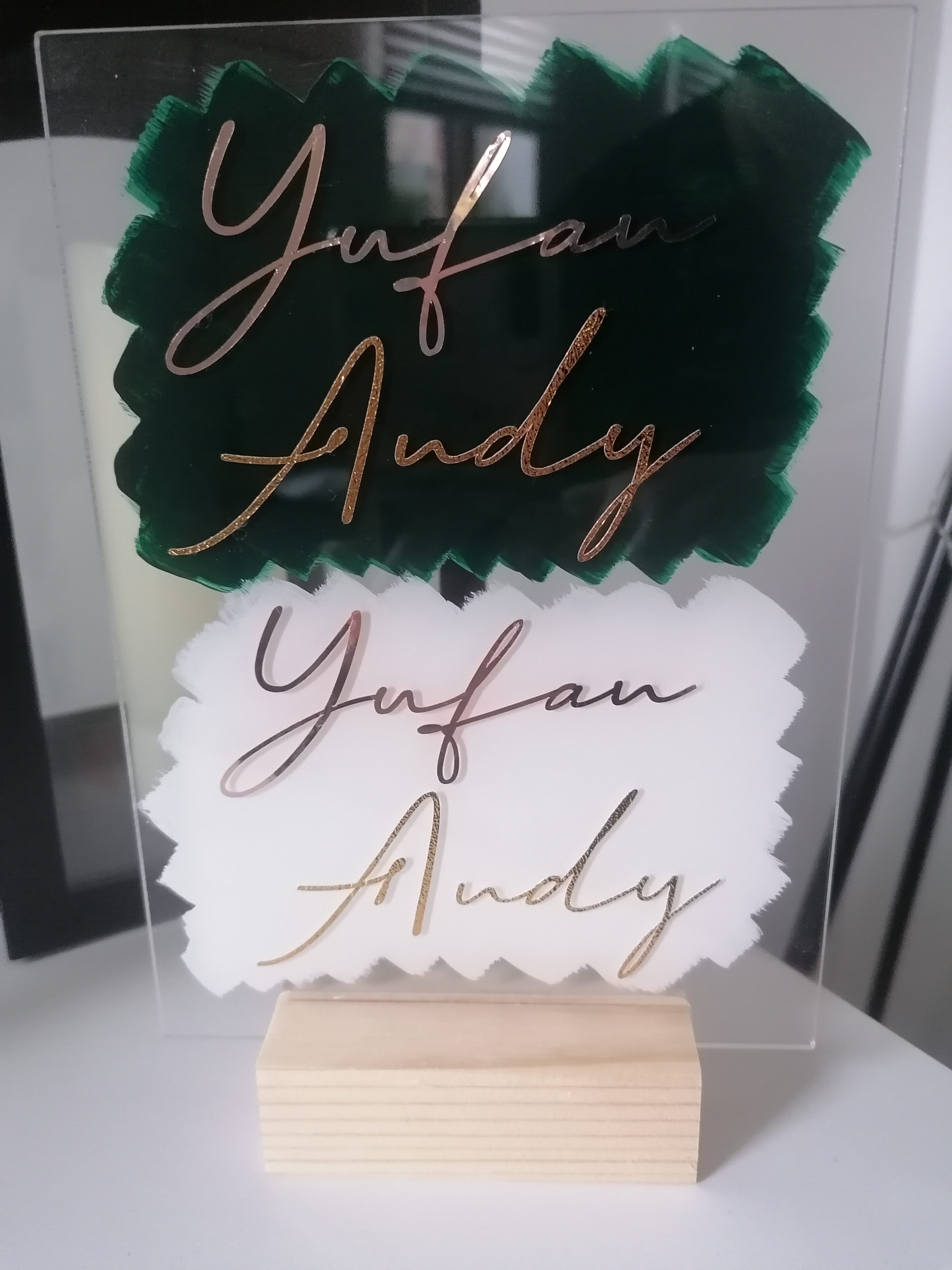 During follow-up meetings we discussed in detail her needs and friction points and made plans how to best tackle these. For tasks that she wanted to tackle herself, we agreed on deadlines and check-in dates and I would follow up and check in with her how it was going and if she needed any assistance. In the meantime I would research different options for decor and get back to her with my results and any recommendations. We went to Hobbycraft together and visited the stylist who would set up her booked venue on the day and picked out items for hire. Among those were a wooden stand for the seating plan and holders for her table numbers on which I then based my designs for the seating plan and table numbers respectively. I also made a mini version of a painted acrylic sign with vinyl so that she would be able to pick the colours for her welcome sign – it’s so difficult to imagine what a paint colour will look like from the bottle and which vinyl you’ll like the look of most!